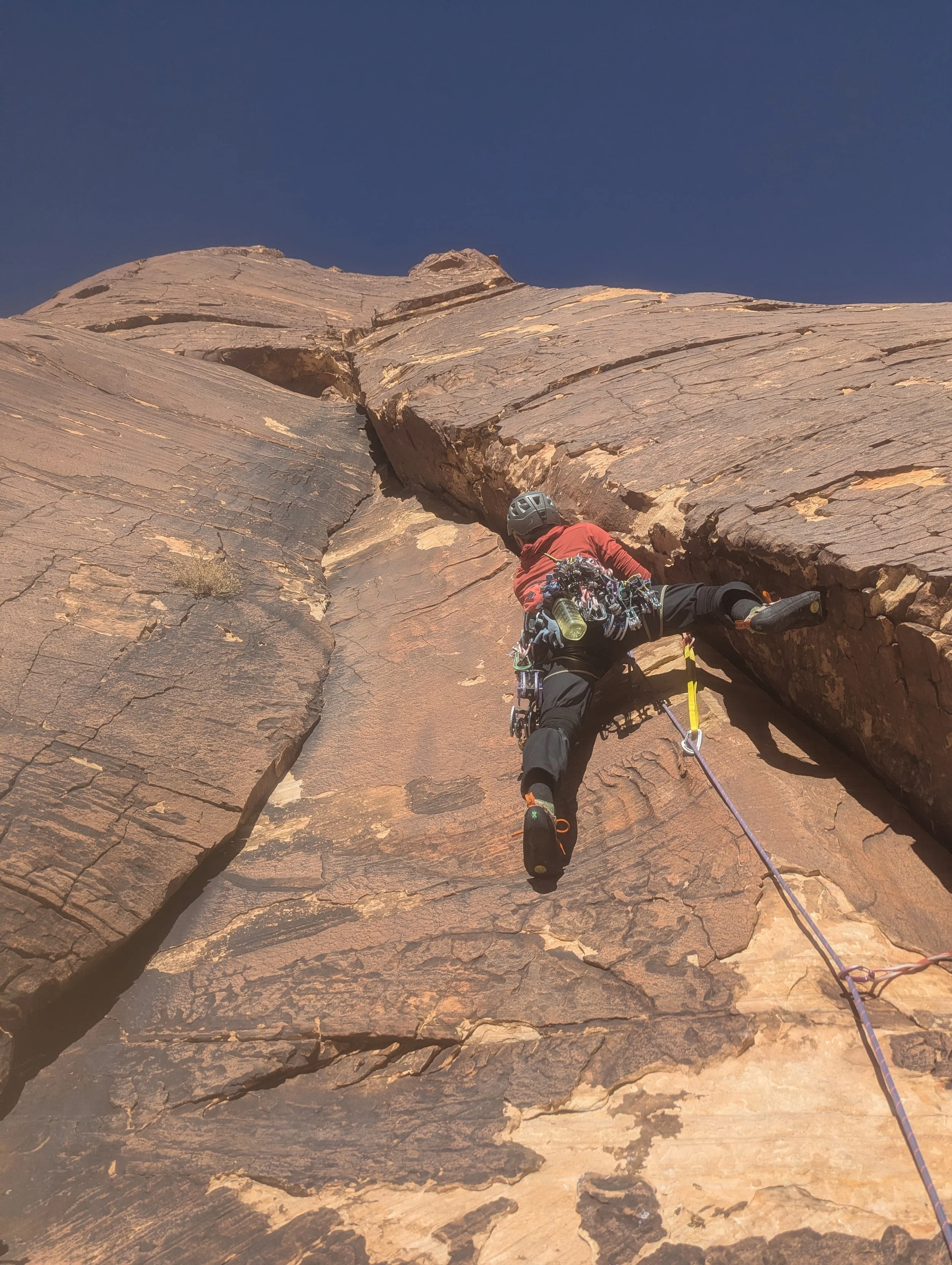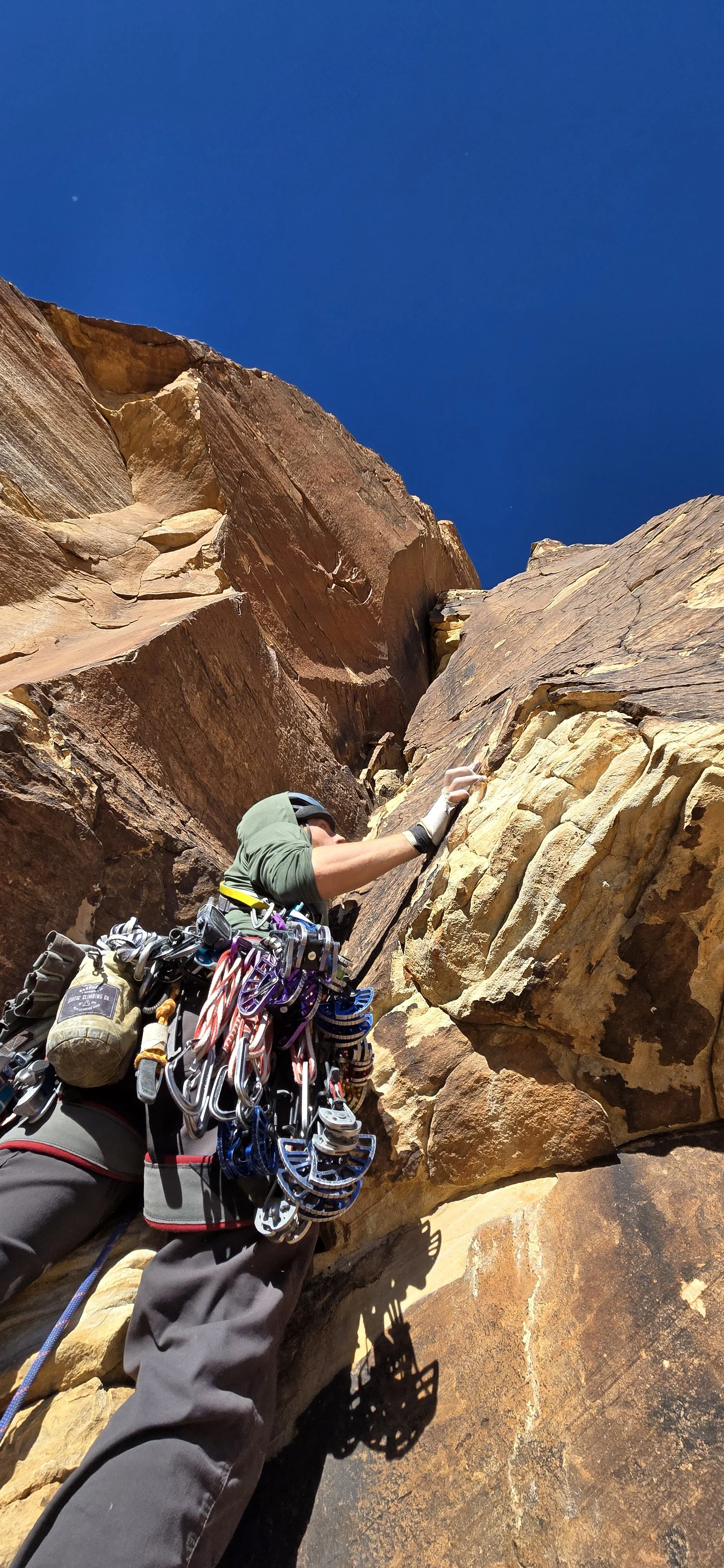 One of my favorite things to riff on, when discussing climbing, is how climbing itself isn’t really a sport that will get you in great shape. It’ll give you some banging forearms and a broad back, but unless you’re going out of your way you’re not going to get a six pack just from a little sport or bouldering. What WILL get you fit, is hiking to the wall, at least in RRC. Double rack and a rope on your back, plus a summer’s amount of water, over 2-3 miles will absolutely develop some core strength. Then you gotta do it all again at the end of the day after some hard climbing and a long walkoff or raps. Hard work is definitely the price of playing the game here, and it’s a worthy price to pay for the reward of the incredibly stellar desert climbing here at the end of the day.