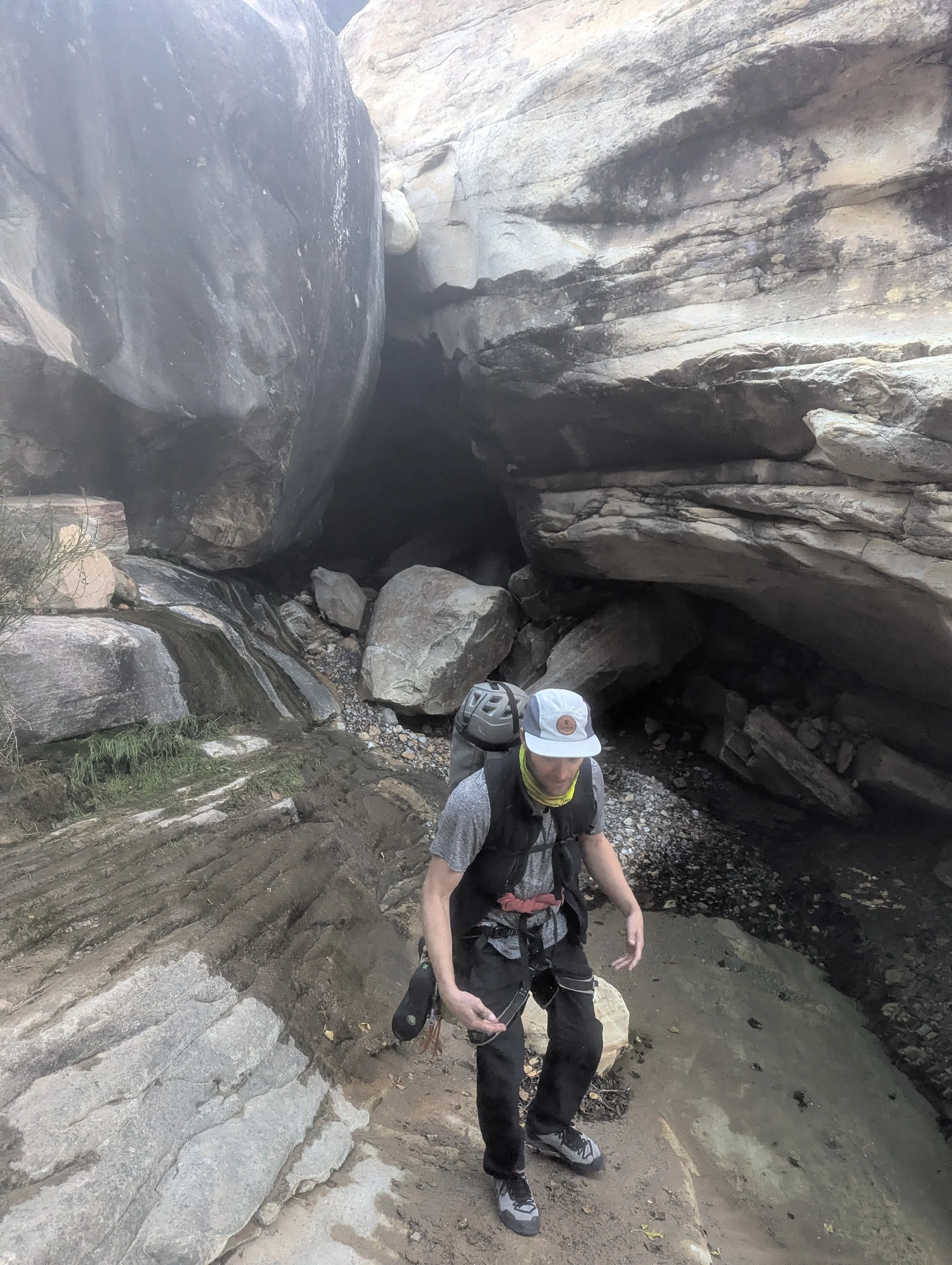 It was then that our day got a little weird. As we were hiking out, we heard a voice call out faintly and unintelligibly near by. I was under the impression that it was the echoes of someone calling “rope” as they rapelled, given the strange bounces that the acoustics in the canyon can create with all the interesting geometry of the walls. After the third or fourth time, however, we both stopped and I remember us looking at each other for a moment in silence before one of us asked, “was that someone saying ‘help’?” After a moment’s wait and another shout, it turned out that yes it was in fact someone shouting ‘help.’