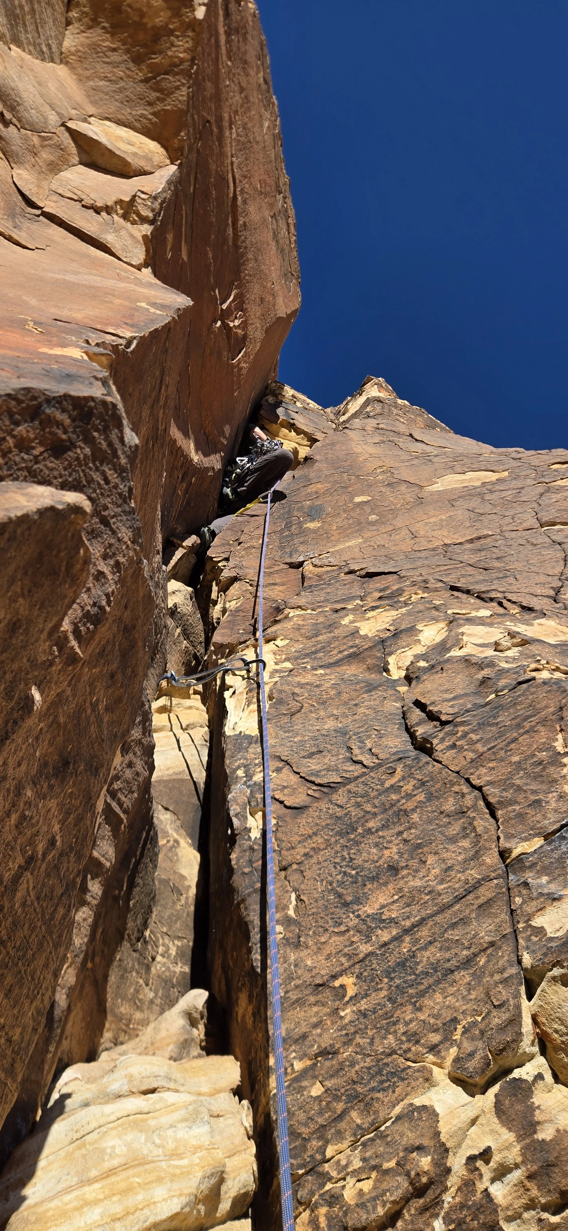 After that it all blurs together. A few more pitches of moderate but burly climbing led us to a ledge equal with the top anchors of the route Mountain Beast. I believe there are a couple easy pitches above this that take you to the top of the formation, but Zak and I were very ready to rap at this point and we made our way down without any issue. Once more at the base of Eagle Wall, we gathered our gear, ogled at the folks on Levitation 29, and began the long downhill trudge back to the wash.