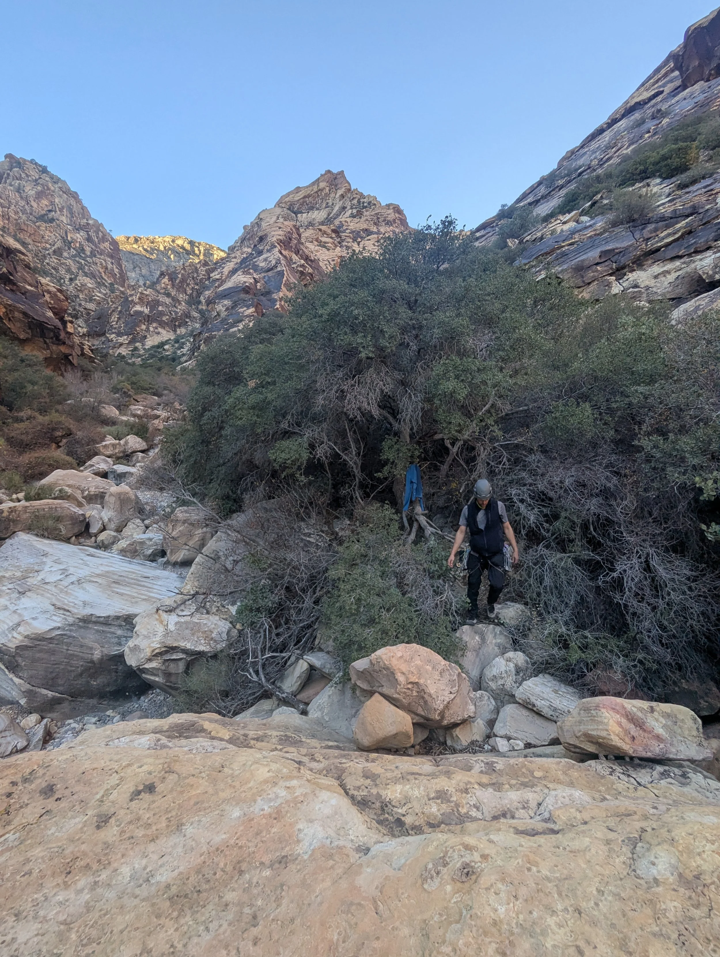 The thing about living in a large city without nearby crags is the gym scene is pretty lively. I met a ton of great climbers and great people (and my wife) in the gyms in Chicago. We get these folks coming out to visit and climb in Vegas, many of them having moved elsewhere to seek climbing themselves. One thing that Vegas is notorious for in my group of friends that have climbed here and other places is the length and difficulty of the approaches. Having climbed in a lot of places myself I can’t disagree with them. I remember thinking that the stairs at Muir Valley were tough, I remember feeling like some of the descents into the Falls were sketchy (when they’re wet they absolutely are,) I remember thinking that the walks out to the Holies with a pad on your back were tough. Man, how times have changed. To be fair, there are absolutely some crags with very friendly approaches in Red Rock: Circus wall is right there with Dog and Fixx right above it, the Rift is close, Ragged Edges and Willow South are a short hike. These are, for the most part, exceptions to the rule. 45 minutes one way is often considered short and easy for many multipitch walls in the canyon, and anything under 2 is something to be scoffed at.